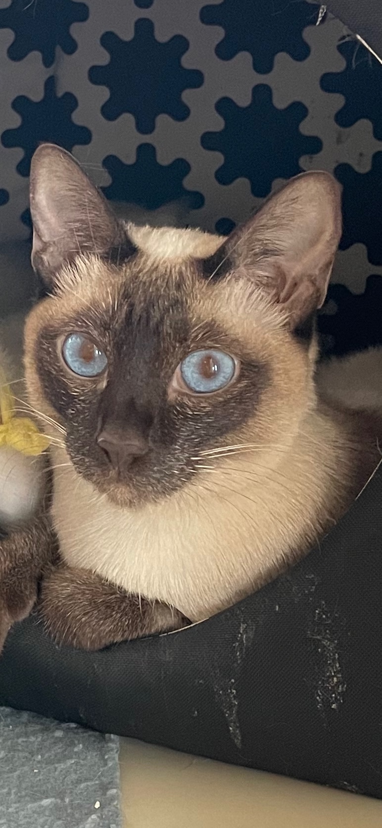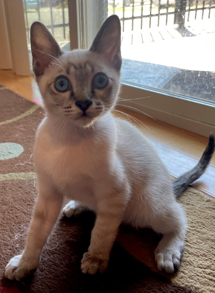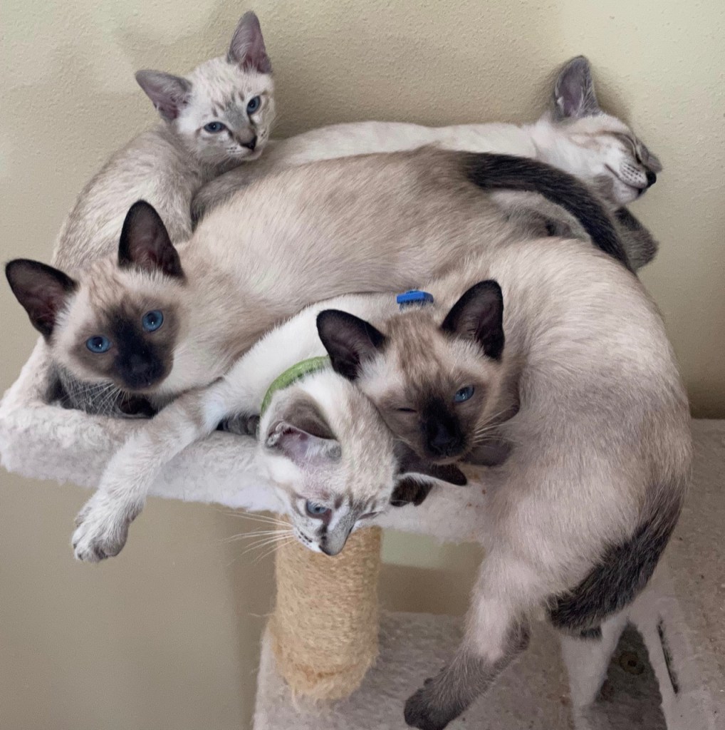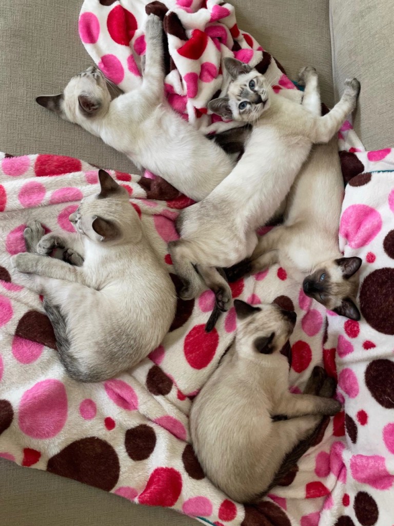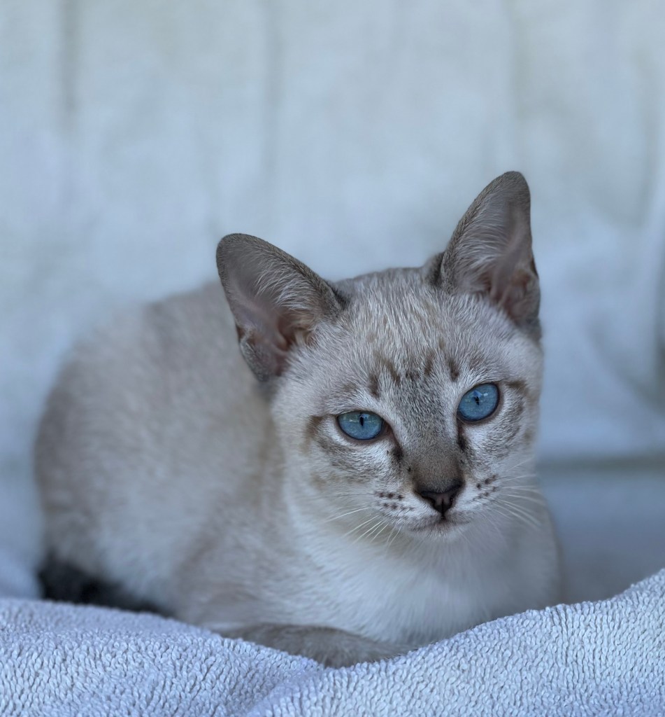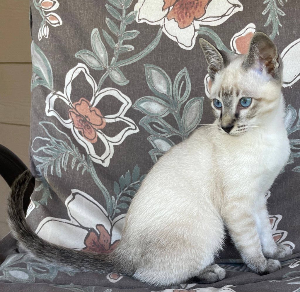 Our seal lynx point, Minerva, born February 2023 had her first litter on September 27, 2024. A seal point male (Flounder, pictured left) and 4 year old retired female (Greta) are looking for a home together. Greta is our retired (spayed) chocolate point female (grandmother to Flounder), and the two are a bonded pair. Flounder is a bit aloof and is more cautious than his littermates, but enjoys snuggling, playing, and experiencing the world on his own terms. He’s actually quite social and very playful — he enjoys investigating and observing the people around him, but prefers that he initiate contact. Because of his concerns about the world, placing him with Greta will help him transition to a new home and have a buddy to help him encounter new experiences. Greta would prefer a home without a dog (she still resents the resident golden retriever she currently lives with), but would adapt if necessary.